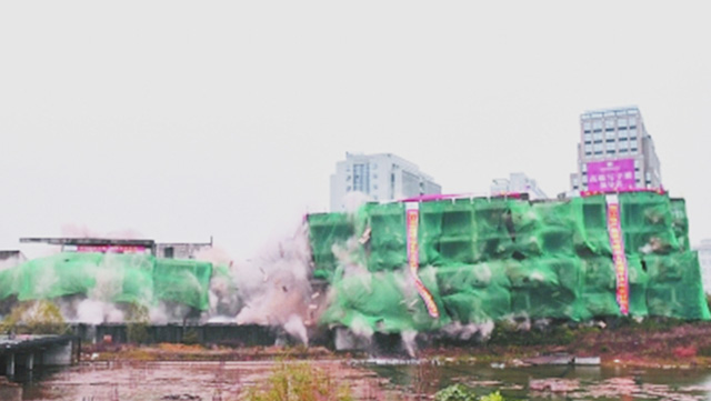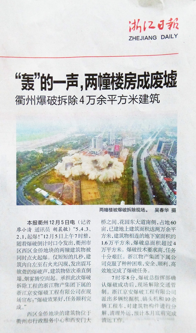 “5、4、3、2、1,起爆!”12月5日上午7时整,随着爆破倒计时口令发出,衢州市区西区金侨地块的两幢建筑物被同时点火起爆。仅短短的几秒,建筑内自南至北火光闪现,发出一阵阵连续清脆的爆破声,建筑物依次垂直倒塌,烟雾腾空而起。承担此次爆破拆除工程的浙江物产集团下属的kok在线登录入口在现场宣布:“爆破效果良好,任务顺利完成!”