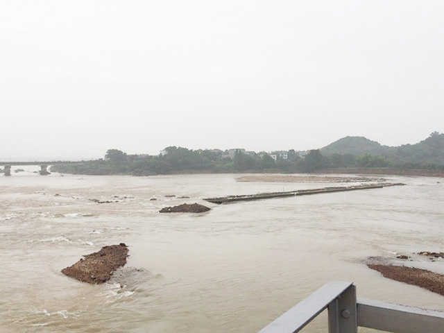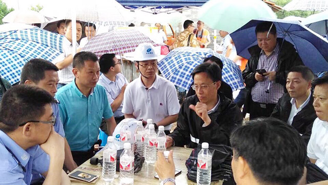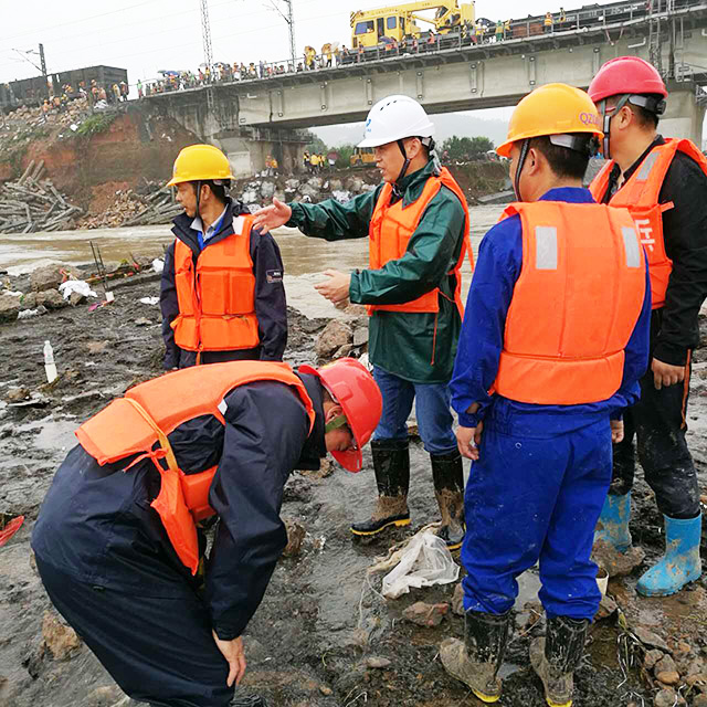 连日暴雨侵袭衢州地区,河水湍急猛涨,6月25日上午9时30分,江山市上余镇突发险情,沪昆铁路江山港大桥0号桥墩一角被洪水损毁,锥体护坡发生严重塌方,防洪堤坝被毁100多米,沪昆铁路货运线路停止通行,客运线路被迫单线通行;6月26日上午,桥墩护坡缺口进一步扩大,铁路路基面临被冲毁危险,现场情况十分严峻!浙江省委书记车俊作出重要批示,省委副书记、代省长袁家军亲自过问险情,衢州市委常委、常务副市长汤飞帆、上海铁路局副局长张杰、衢州市副市长兼江山市委书记吕跃龙、江山市委副书记、市长舒畅等各级领导第一时间亲临现场坐镇指挥抢险工作。